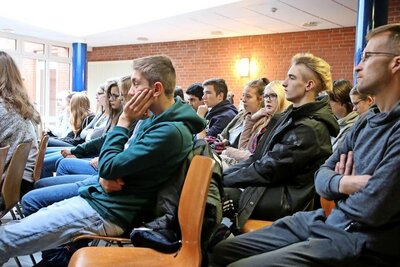 Die Schüler der Klassenstufen 9 und 10 hören Jurek Szarf gebannt zu.